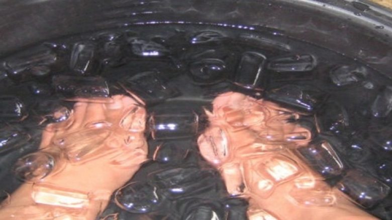 Fillimisht mbusheni një legen me ujë të ftohët dhe pastaj shtoni aq më shumë akuj që mundeni. Pas kësaj, zhytni këmbët në ujin e ftohët dhe mbani ashtu për 10 deri në 15 sekonda.